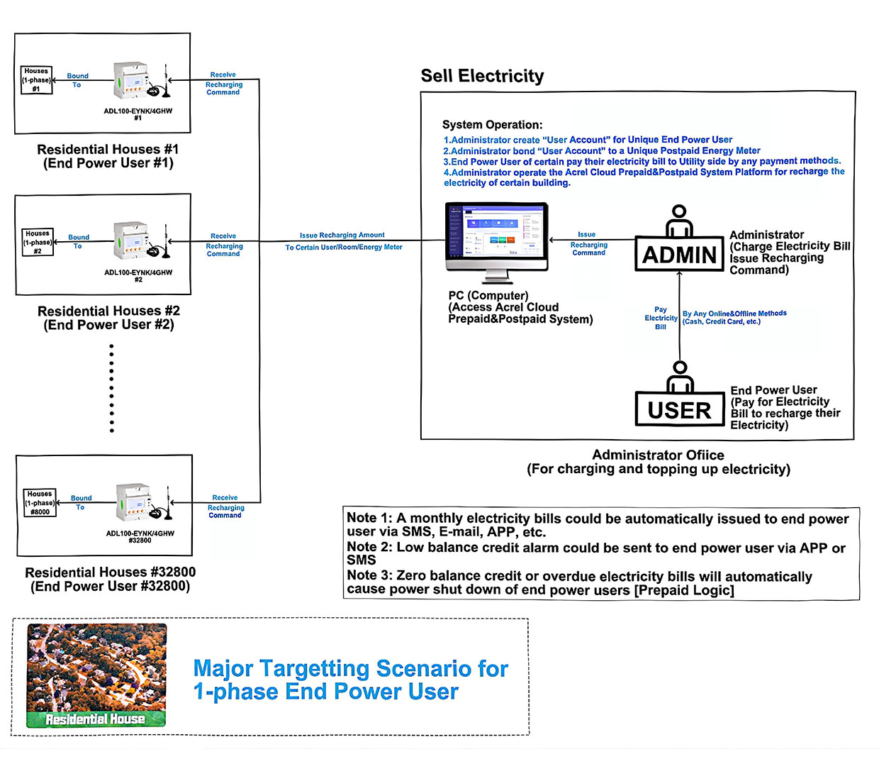 Il sistema di fatturazione prepagato/postpagato end-to-end Acrel è stato creato appositamente per dormitori scolastici, centri commerciali, parchi industriali e complessi residenziali. L'architettura a tre livelli inizia con i contatori intelligenti ADL100-EY (monofase) e ADL300-EY (trifase); ciascuno integra un relè ad aggancio magnetico da 100 A, supporta DL/T 645 e Modbus-RTU e registra kWh con precisione di Classe 1.