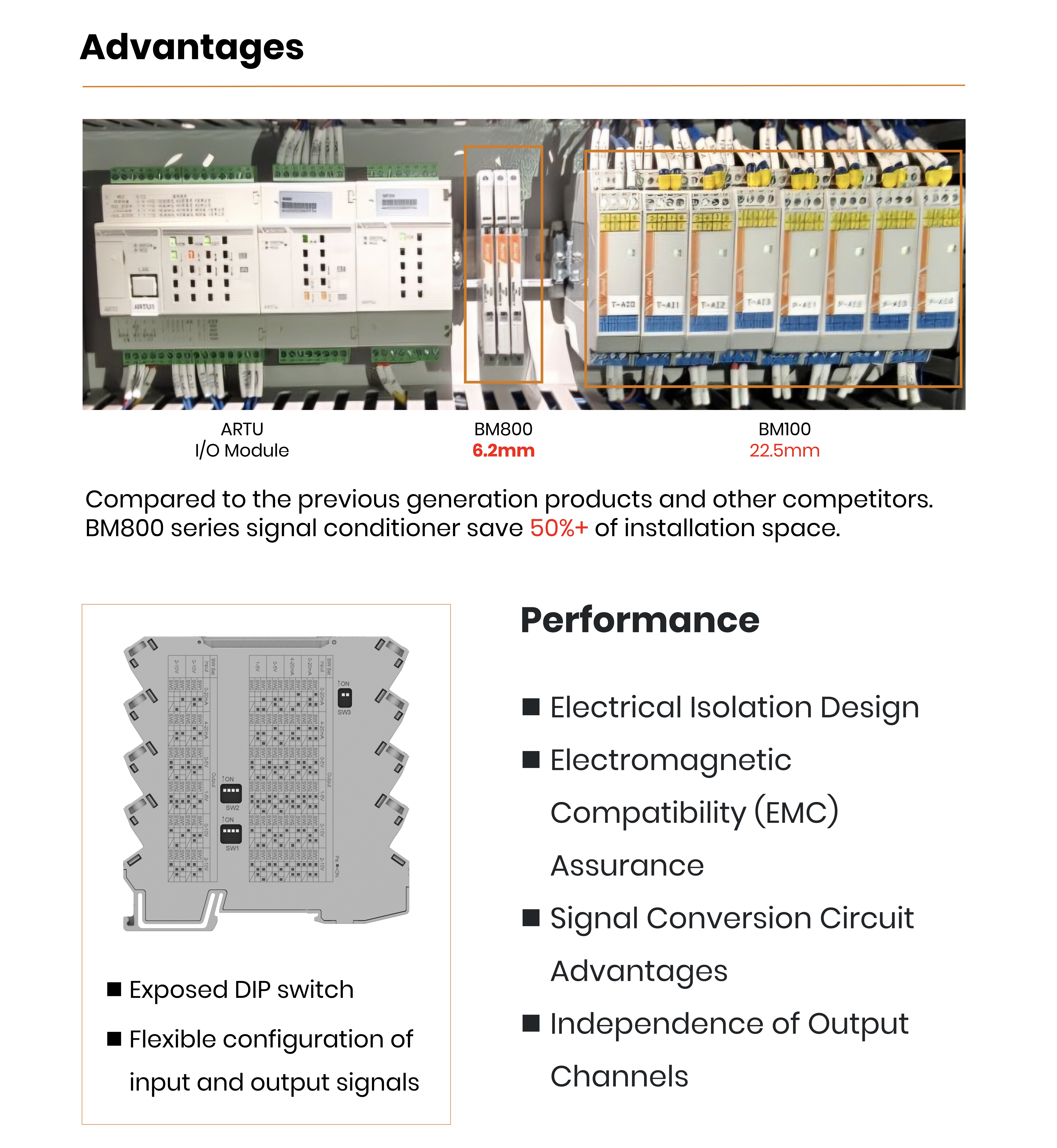 Il condizionatore di segnale serie BM800, noto anche come isolatori di segnale, convertitori di segnale e trasduttori di segnale, è un dispositivo di condizionamento del segnale industriale avanzato con un design super sottile da 6,2 mm, che consente di risparmiare oltre il 50% dello spazio di installazione. Vanta una precisione dello 0,1%, garanzia di compatibilità elettromagnetica e funzionalità come isolamento elettrico, vantaggi del circuito di conversione del segnale e canali di uscita indipendenti. Con un interruttore DIP per una configurazione flessibile del segnale di ingresso e di uscita, può elaborare vari segnali come 0/4~20 mA, 0/1~5 V, ecc. Ha anche prestazioni eccellenti in termini di deriva termica, tempo di risposta e resistenza dell'isolamento.