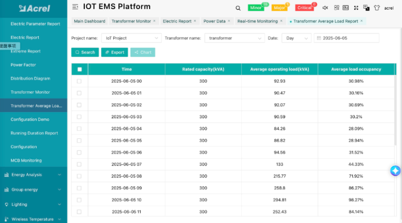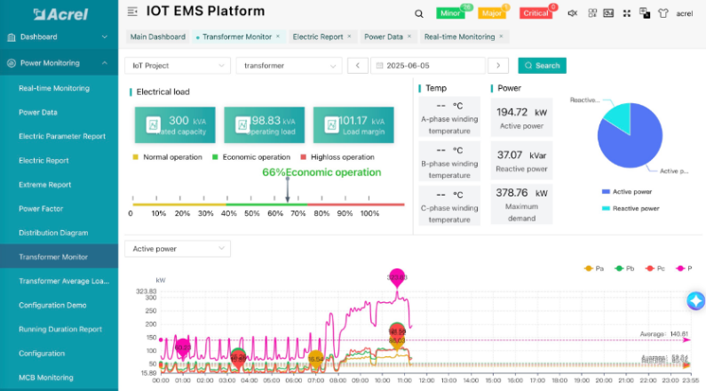 2. Visualizzazione del funzionamento del trasformatore: La piattaforma monitora continuamente i parametri critici (corrente, tensione, fattore di potenza, ecc.), garantendo che i trasformatori funzionino entro limiti di carico sicuri e riducendo il rischio di sovraccarico e danni.